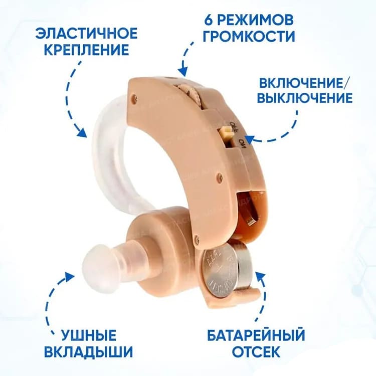 Устройство для усиления слуха изготовлено из прочного безопасного пластика, оснащен силиконовыми ушными вкладышами для дополнительного комфорта.